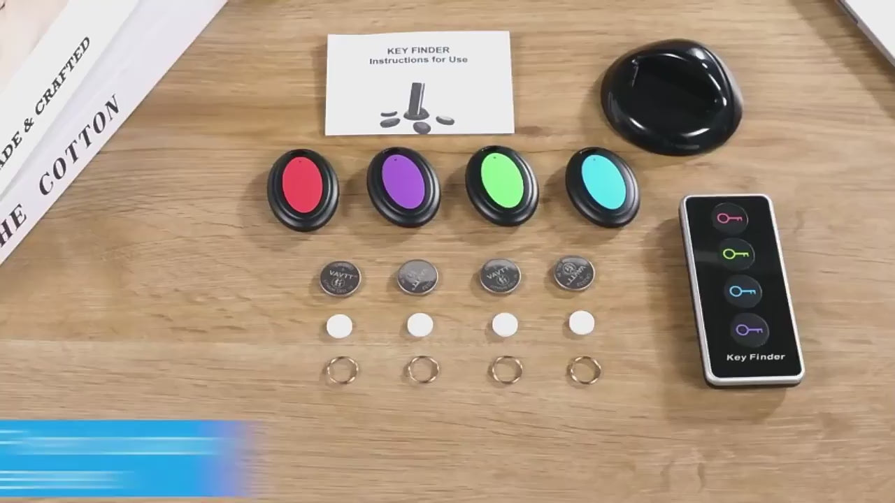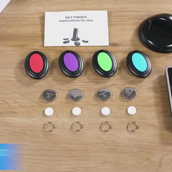 El localizador de permite etiquetar 4 objetos diferentes y hacer que suenen pitidos de búsqueda al pulsar el botón correspondiente codificado por colores del transmisor.